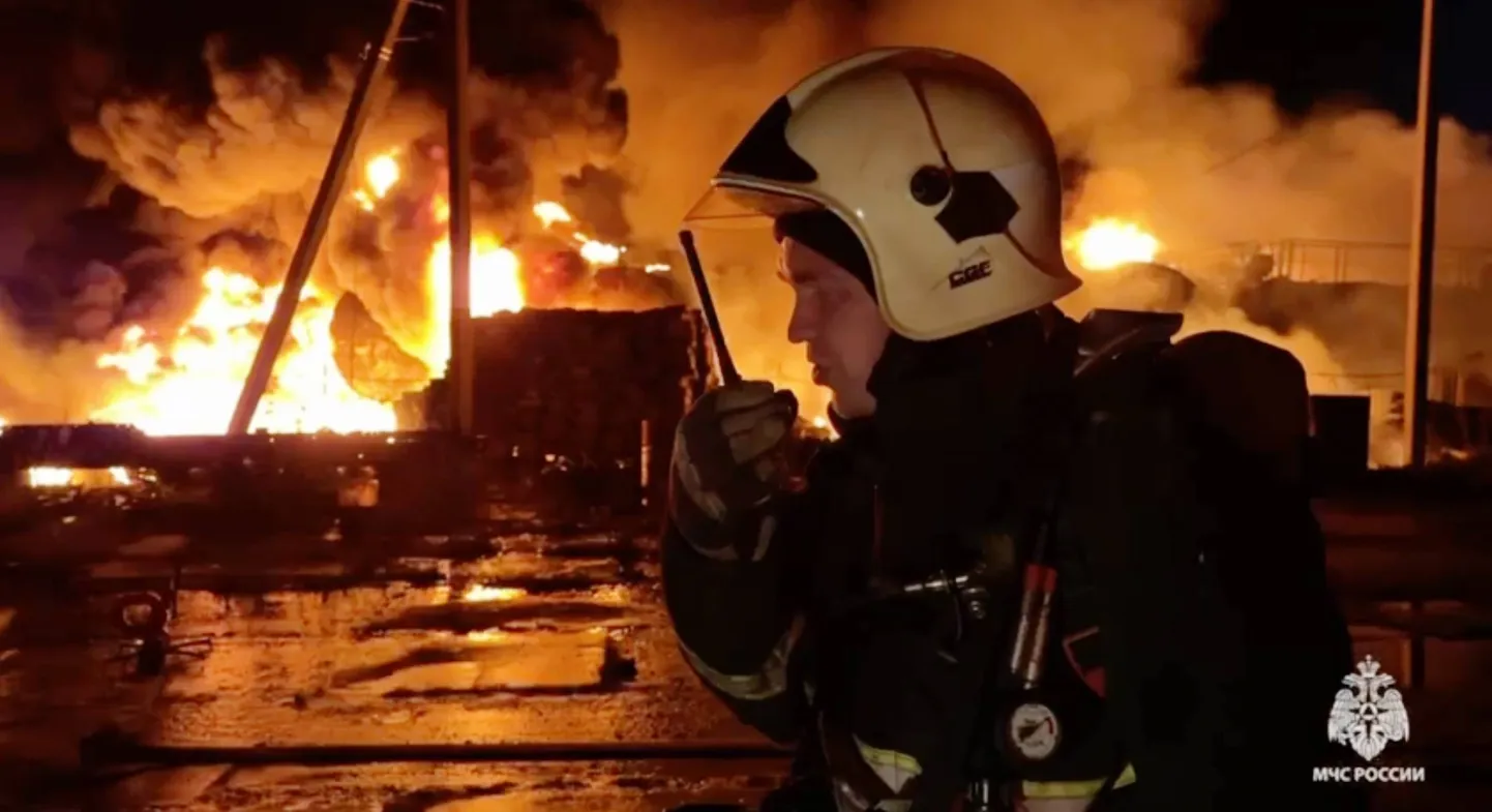 Seen here, a pillar of flame rises from the refinery complex, one of Russia’s largest. pic.twitter.com/Z3xoeyOoQ2